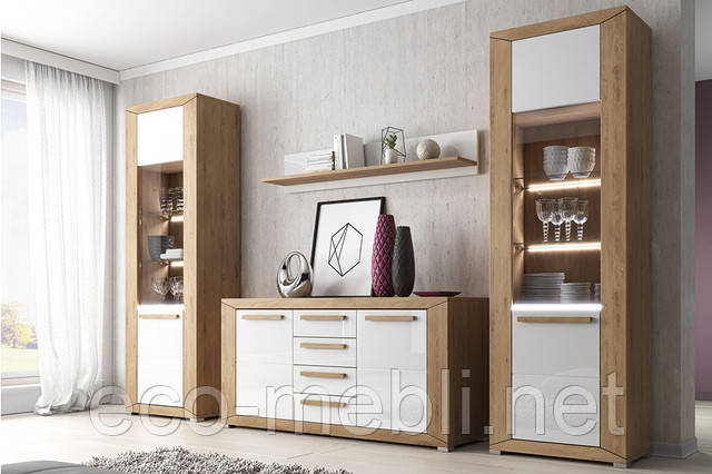 Меблі для вітальні LUMI Helvetia є ідеальним рішенням для клієнтів, які люблять земні тони. Система доступна в двох колірних варіантах: ЛДСП в Бюфорт дубовий колір в поєднанні з білими фасадами і клеєного бруса в дубовому кольорі каньйону монумент в поєднанні з сіро-кольоровим піском. Меблеві фасади були покриті високоякісної мембраною глянцю, що забезпечує довгий термін служби і гладку поверхню дизайнерських меблів. Для зручності напрямних встановлені ящики з повним розширенням, що забезпечить легкий доступ до всіх елементів, що зберігаються в них. Сайти і комоди профіль монтується зі світлодіодним підсвічуванням, що надає інтер'єру цікавий погляд. Для того, щоб додатково виділити елементи, можуть бути встановлені прожектори світлодіодного освітлення в якості опції.